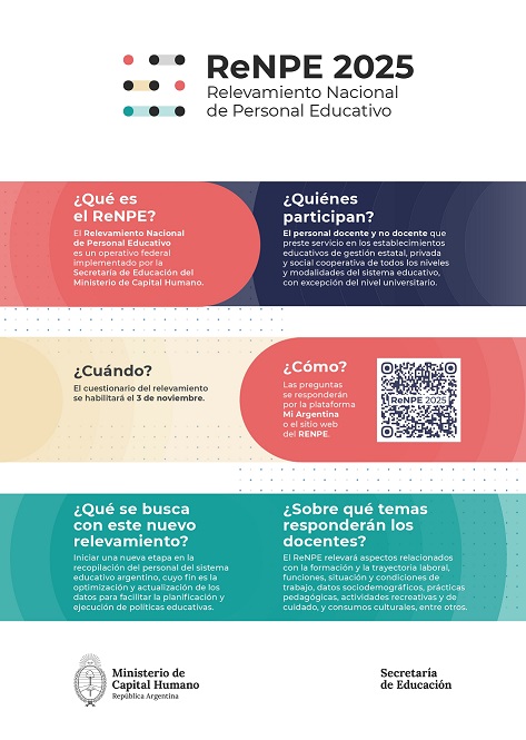 El Ministerio de Capital Humano, a través de la Secretaría de Educación de la Nación, informa la puesta en marcha del Relevamiento Nacional de Personal Educativo (ReNPE), un operativo federal desarrollado en el marco de la Red Federal de Información Educativa (RedFIE). Esta iniciativa tiene como objetivo principal relevar información detallada y actualizada sobre el personal docente y no docente que se desempeñan en instituciones educativas de gestión estatal, privada y social cooperativa, en todos los niveles y modalidades del sistema educativo, con excepción del nivel universitario.